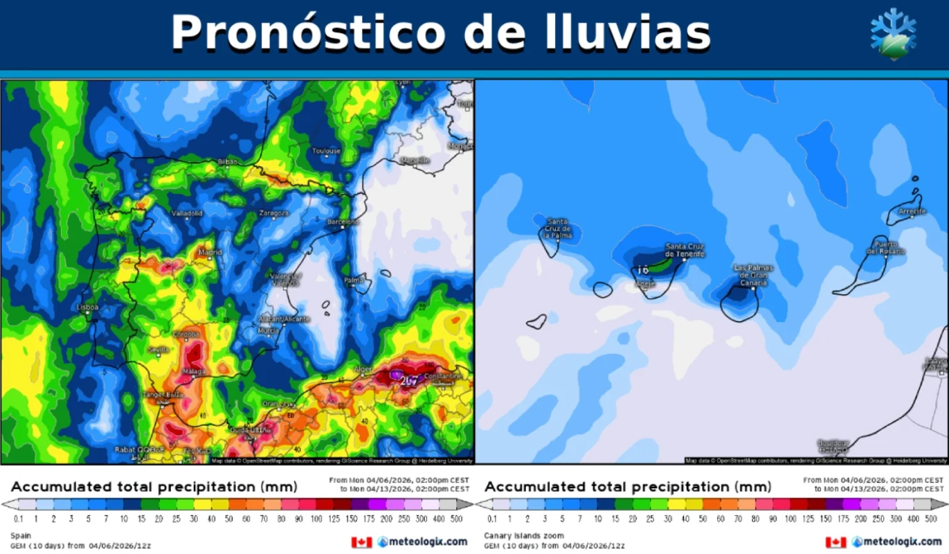 Estas son las lluvias ⛈️☔ previstas a 7 días en España según el modelo canadiense (GEM)
