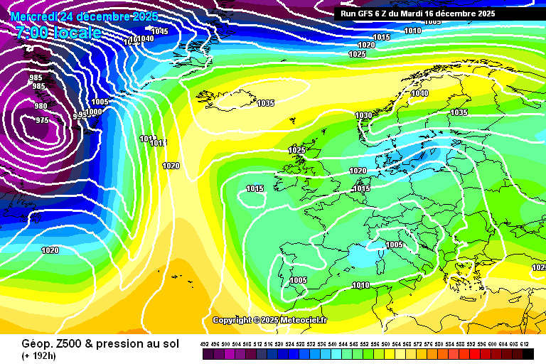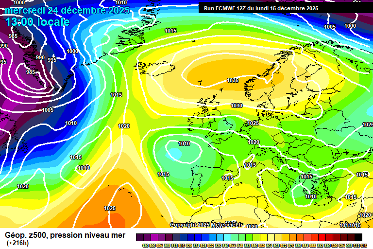 En este pronóstico para comienzo de las Navidades, se observa el bloqueo en latitudes más altas, con centros de bajas presiones al sur de Europa, que estarían impulsando masas de aire desde el congelador ruso hacia Europa.