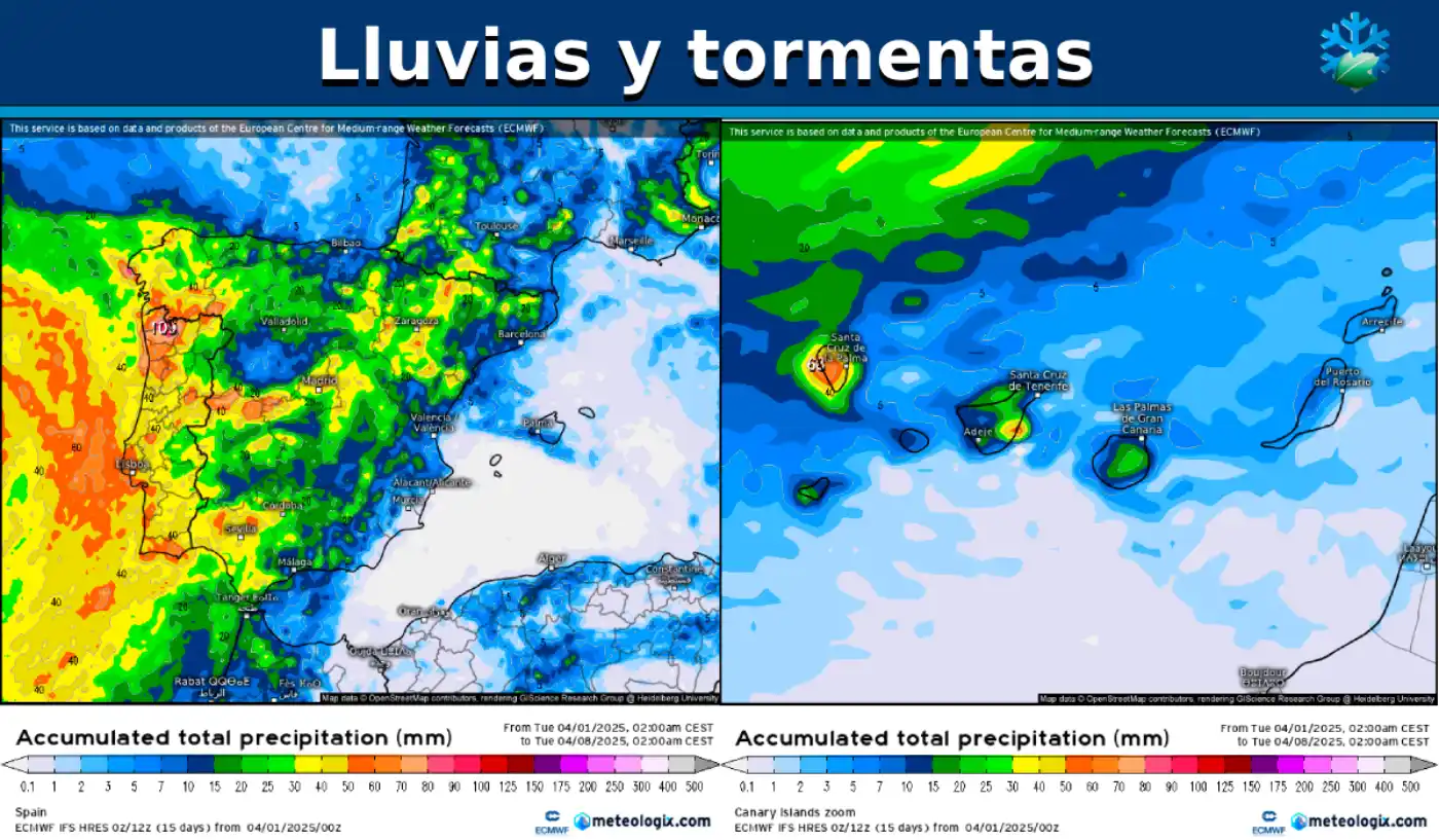 A continuación, te voy a mostrar las consecuencias en los mapas de precipitación total acumulada actualizados esta mañana por el modelo.