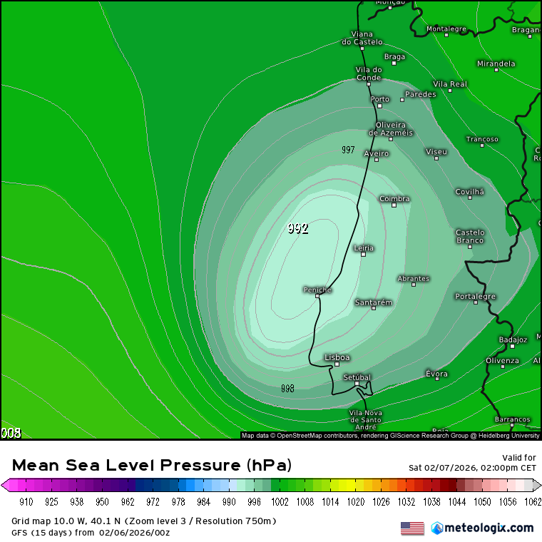 Realmente es una buena prueba de la incertidumbre que hay en este tipo de pequeñas depresiones secundarias, lo que nos dibuja, por ejemplo, el modelo estadounidense. La trayectoria de la borrasca Marta está mucho más al sur. Cuanto más al sur se mueva, menos intensidad alcanzarán sus vientos, ya que su presión mínima central no desciende tanto.