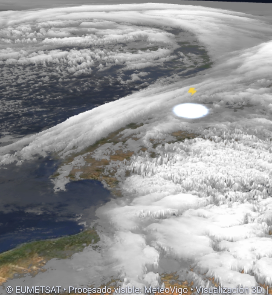 En estas imágenes de satélite en 3D podemos ver cómo el frente está entrando por el noroeste peninsular, con chubascos post frontales que se observan detrás llamando a las puertas de Europa.