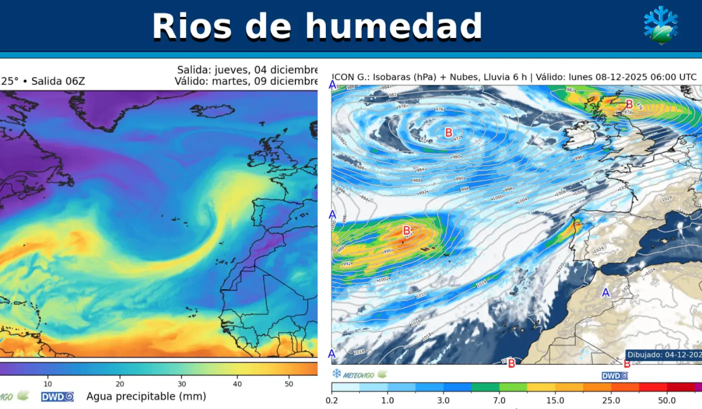 Estos ríos de humedad potencian las precipitaciones, que serán localmente fuertes en algunas regiones orientadas al Atlántico, como Galicia.