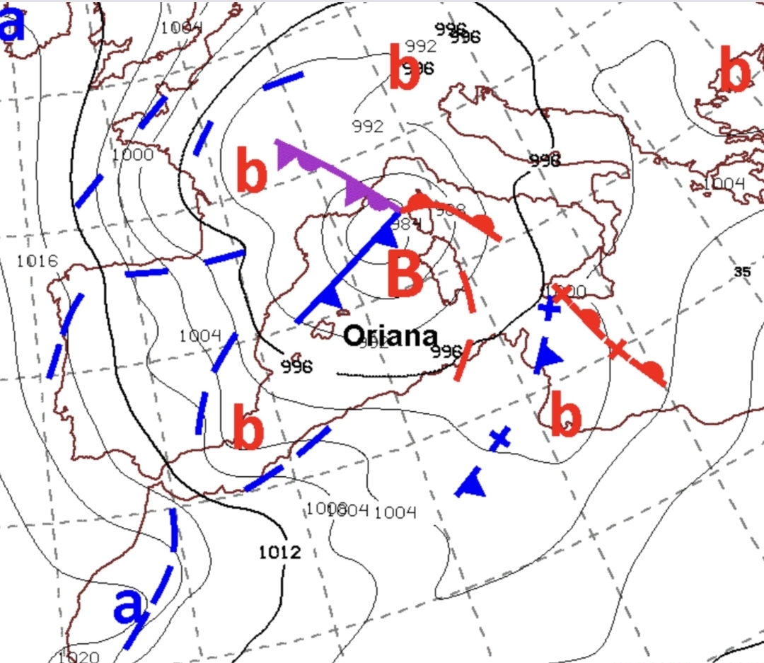 La borrasca que hemos estado siguiendo en los últimos días ha sido bautizada como Oriana, borrasca de alto impacto encargada de inyectar vientos desde latitudes árticas sobre la mayor parte de España.