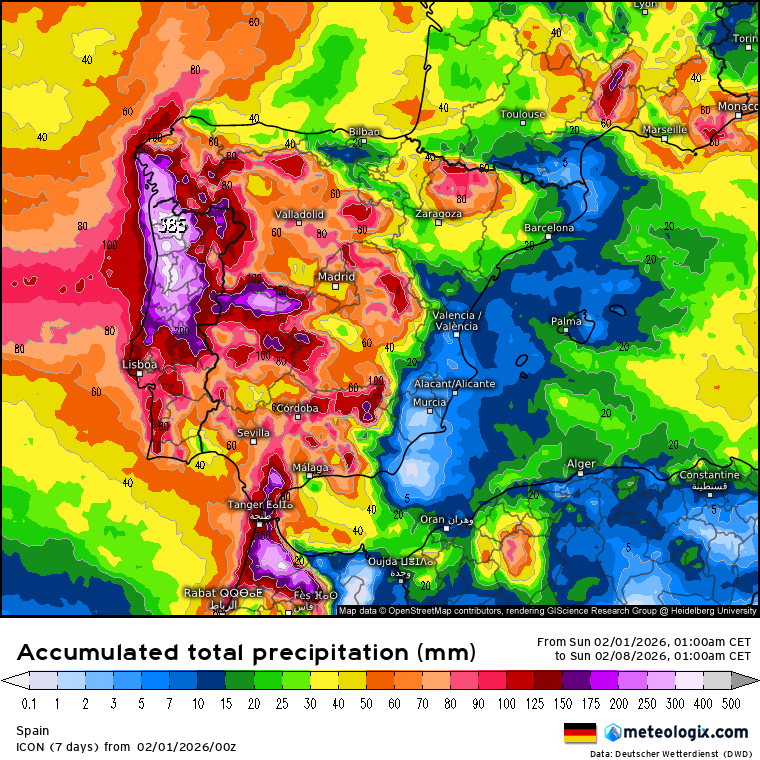 Como puedes observar las precipitaciones abundantes se extienden por la mayor parte de la geografía, con menor afectación a zonas de la mitad oriental peninsular, sobre todo en la Comunidad Valenciana y Murcia.
