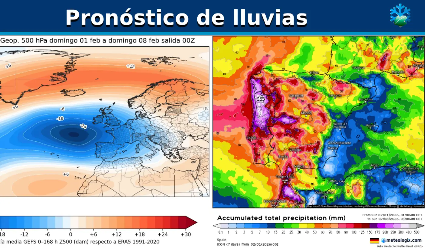 En este mapa podemos detectar los bloqueos en latitudes árticas, que fuerzan una circulación de masas de aire más frías y comprimidas sobre la vertical de la mayor parte de España, salvo Canarias.