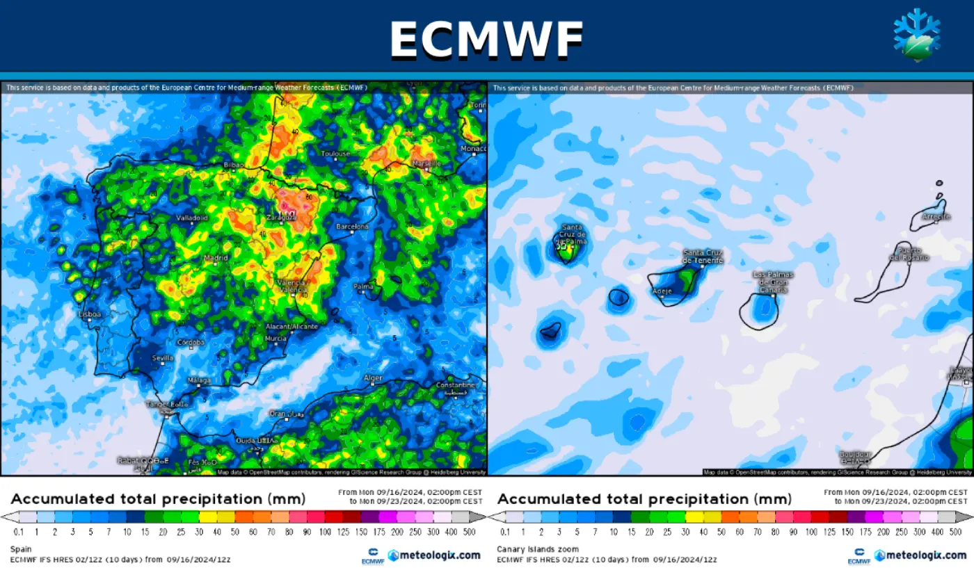 El modelo europeo nos muestra esta tarde en sus mapas de precipitación total acumulada el alcance previsto del episodio de precipitaciones tormentosas, que se va a extender por la mayor parte de España.