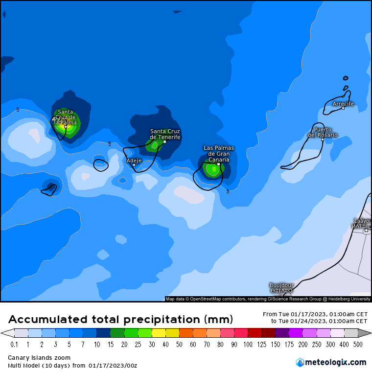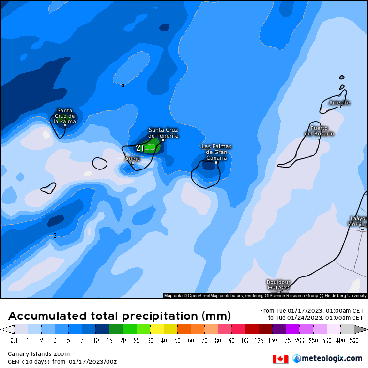 En Canarias se observan precipitaciones significativas, sobre todo en las islas de mayor relieve en su cara norte. La isla de La Palma es la que presenta dibujos con mayores acumulados en estos momentos. Ceuta y Melilla también presentan algunas precipitaciones en los dibujos.