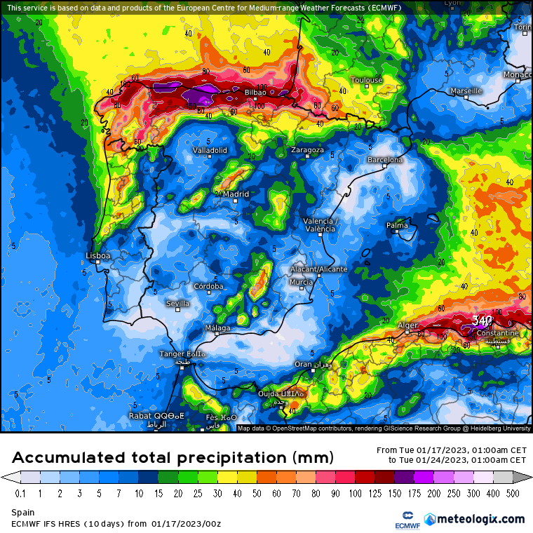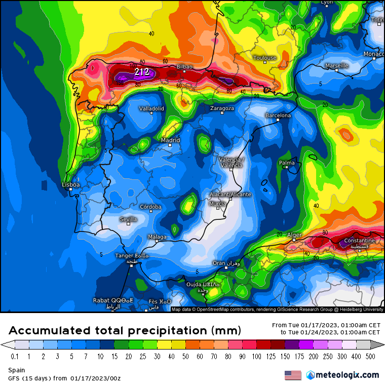 Debido a la procedencia de las masas de aire que favorecen la inyección de humedad sobre el Cantábrico, las precipitaciones más importantes las veremos en el extremo norte. Las zonas de alta montaña son como grandes exprimidores que consiguen retener más las precipitaciones, por lo que los dibujos muestran unos mayores acumulados.