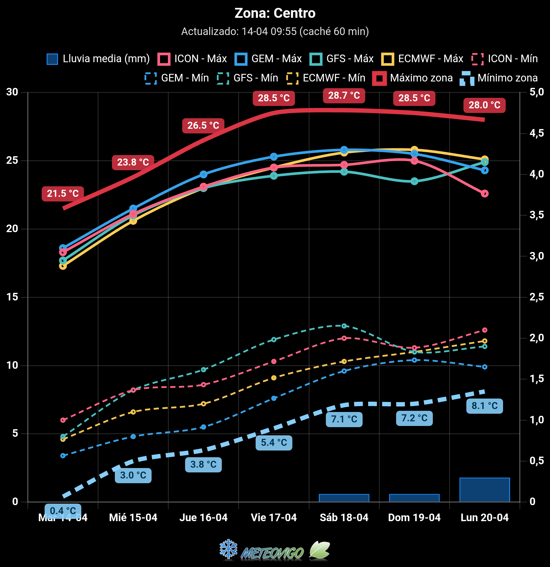 En el siguiente pronóstico de te voy a mostrar la evolución según cuatro modelos meteorológicos en el centro peninsular durante los próximos 7 días.