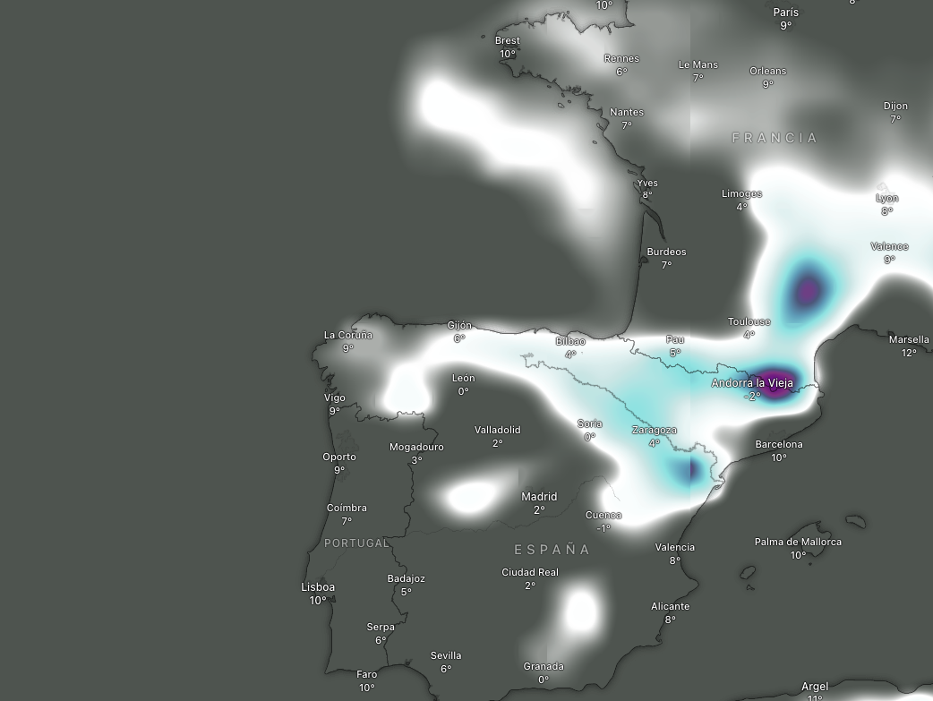 Pero los tres coinciden en dibujar estas nevadas a nivel del mar saliendo de las costas de Francia en dirección al norte de la península.