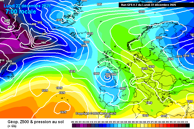 Se observan temperaturas muy bajas, sobre todo a nivel de 850 hPa, con la -8º saliendo por las costas de Francia. Esa temperatura en esa capa es compatible con nevadas a nivel del mar.
