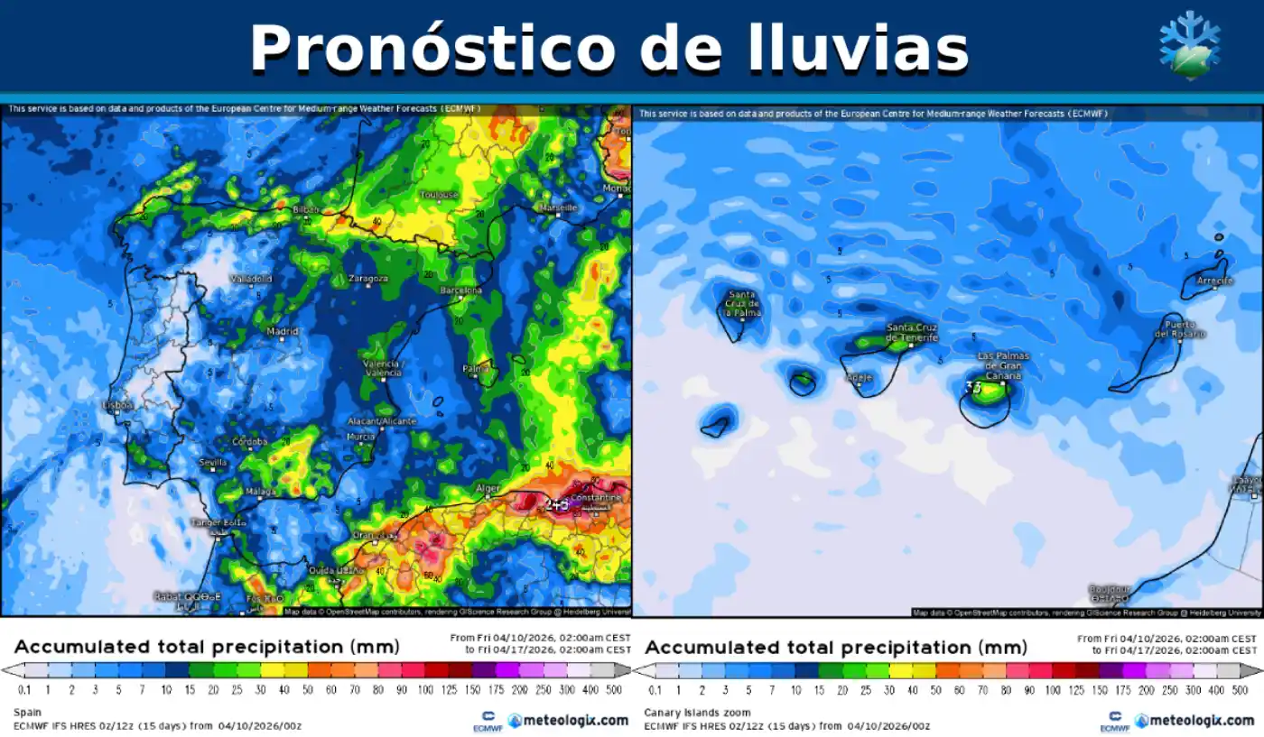 Interpretar el mapa: la escala de colores dibuja las precipitaciones totales que, según el modelo, se van a recoger en toda España durante el período analizado.
