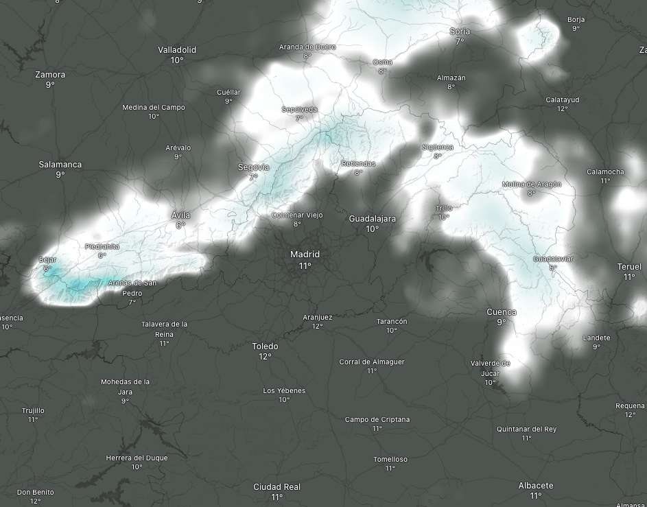 Mapa de extensión de nieve nueva en la Comunidad de Madrid