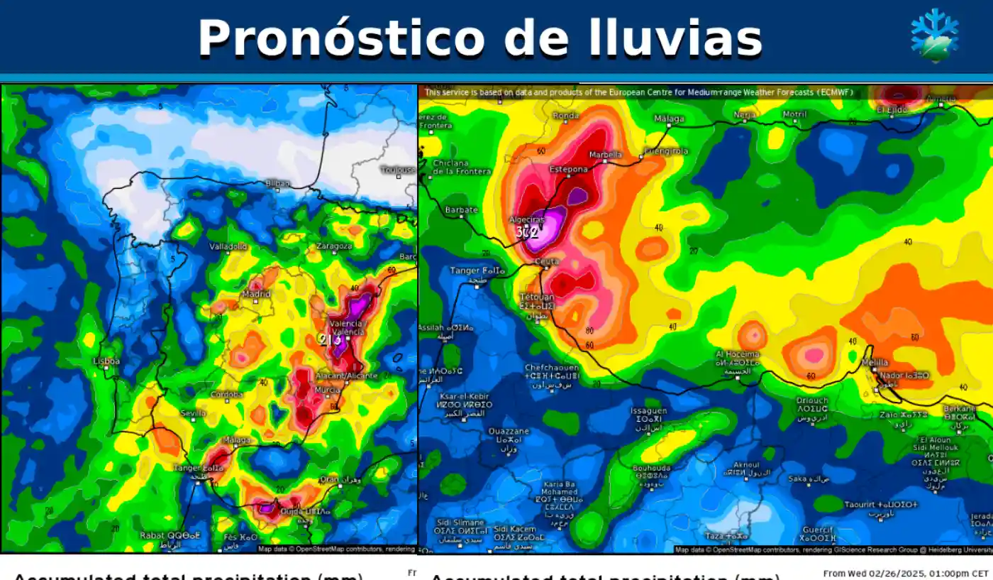 El modelo GFS sigue apostando por el entorno de Melilla con más de 160 mm. El modelo europeo apuesta por el entorno del Estrecho con acumulados de más de 300 mm. En cambio, el modelo canadiense sigue insistiendo en los acumulados más contundentes sobre la Comunidad Valenciana, con registros de más de 200 mm.