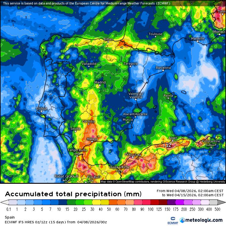 El modelo europeo ha actualizado esta mañana con mapas de precipitación total acumulada que siguen dibujando un panorama muy inestable sobre buena parte de la geografía.