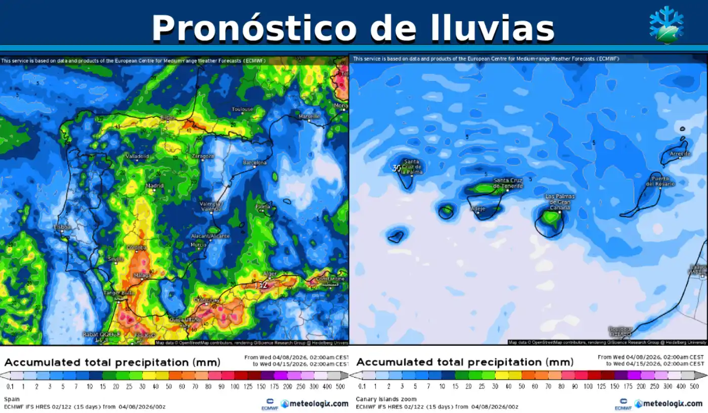 El modelo europeo ha actualizado esta mañana con mapas de precipitación total acumulada que siguen dibujando un panorama muy inestable sobre buena parte de la geografía.
