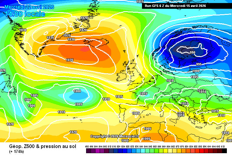 En este pronóstico para mediados de la próxima semana, podemos detectar el potente bloqueo desarrollado sobre Islandia. Sobre ese centro de altas presiones, los vientos giran en sentido de las agujas del reloj.