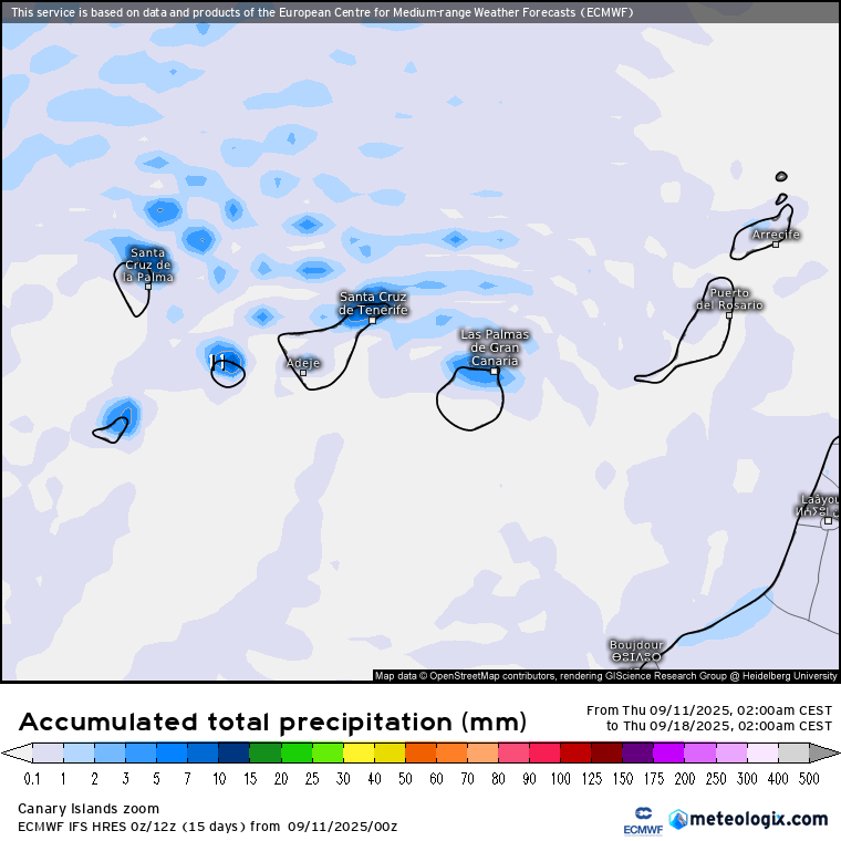 Sobre Canarias, observamos algunas precipitaciones, afectando mayormente a la cara norte de las islas de Gran Canaria y occidentales.