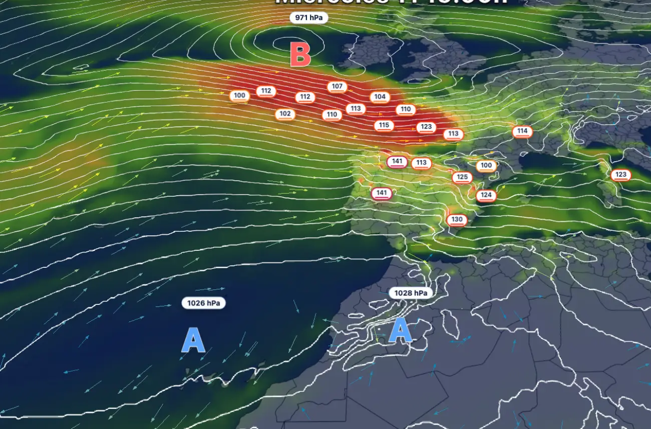 Esta gran diferencia de presión entre puntos atmosféricos obliga a la atmósfera a desplazar masas de aire con rapidez desde las altas presiones hacia las borrascas en busca del equilibrio. Cuanta mayor sea la diferencia de presión entre puntos, más rápido se tienen que mover las masas de aire (vientos) para compensar.