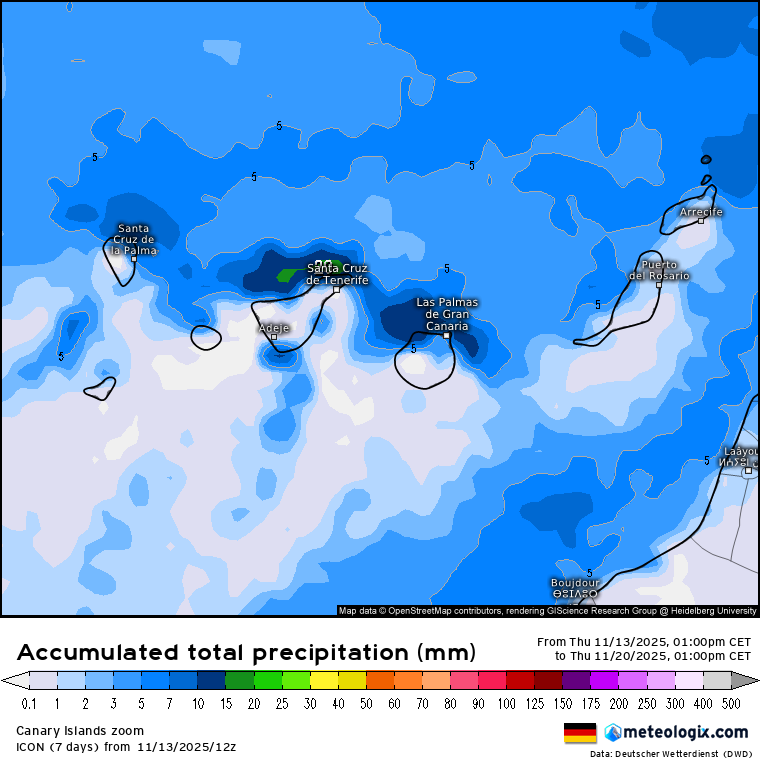 Sobre Canarias, los acumulados ya han perdido mucho colorido, debido a que no llegan nuevas precipitaciones detrás como en la península. El frente ha pasado por el archipiélago y los acumulados a futuro ya son menores.