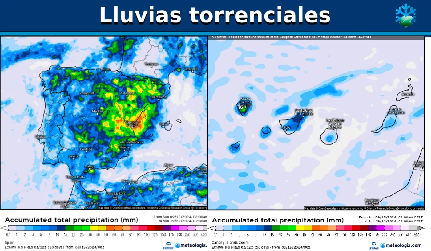 Recuerda que tenemos una escala de colores que dibuja las precipitaciones totales que se van a recoger en nuestro país según el modelo durante dicho periodo.
