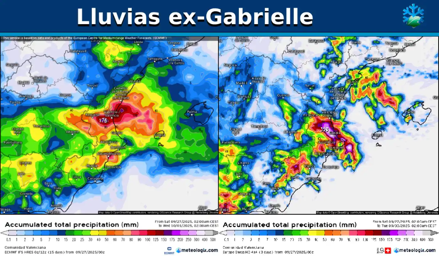 Además, te voy a enseñar como modelos de alta resolución como el suizo, nos muestran acumulados de más de 300 mm en la Comunidad Valenciana.