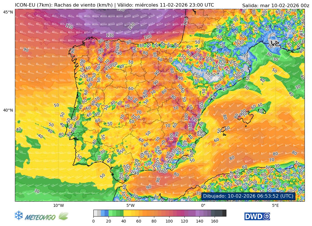 En este pronóstico para mañana por la noche podemos ver cómo el modelo alemán (ICON) dibuja rachas de viento superiores a los 150 km/h barriendo el Cantábrico en dirección a Francia.