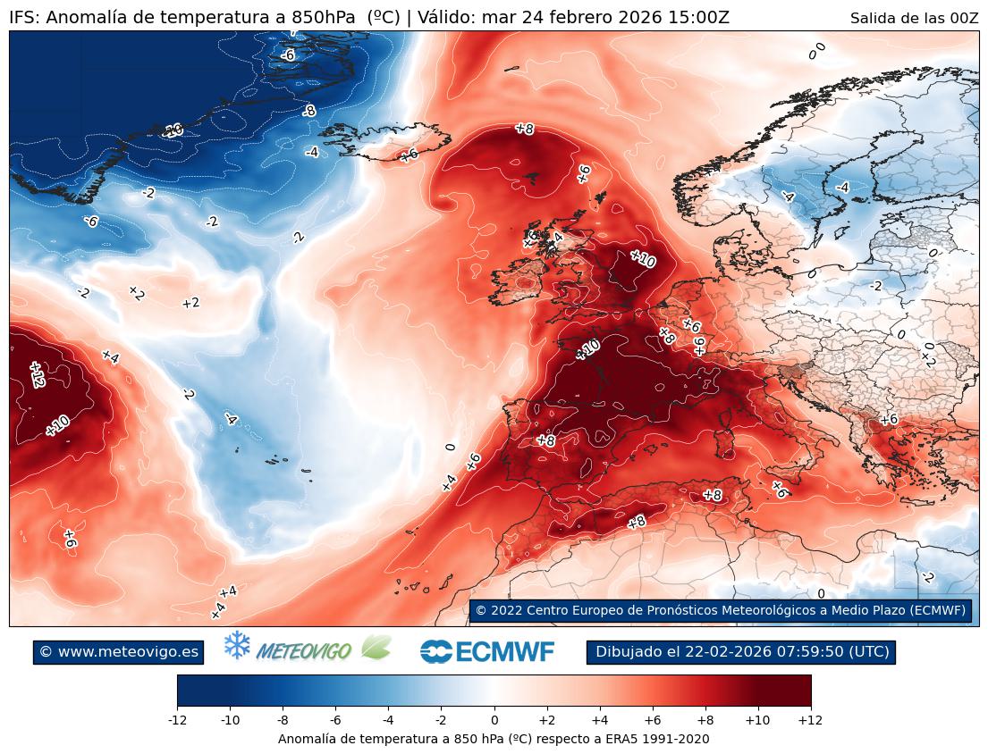 En este mapa previsto para el próximo martes podemos ver la lengua de aire más cálido de lo habitual extendiéndose desde el suroeste de Europa.