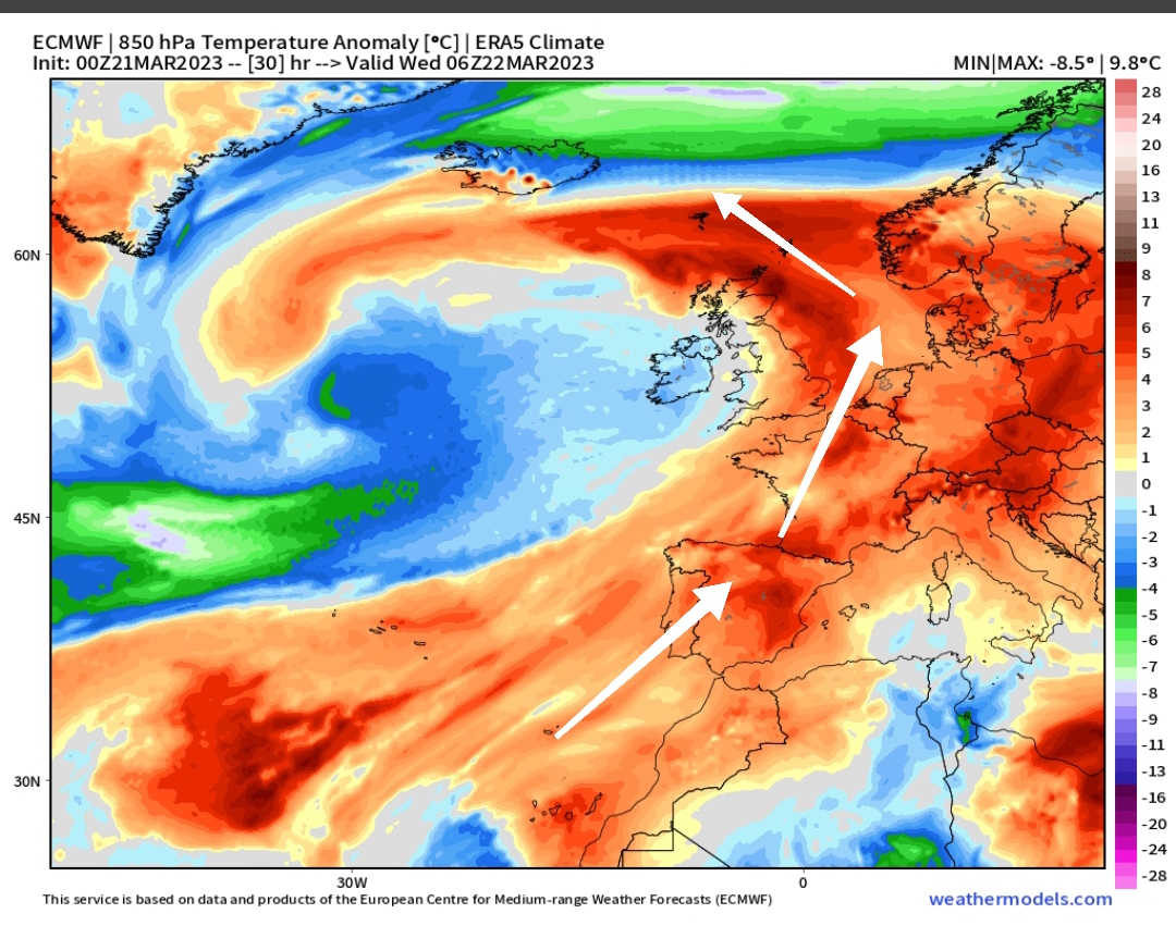 Las borrascas atlánticas se van a encargar de inyectar masas de aire más cálidas de lo habitual desde latitudes inferiores sobre amplias zonas de continente europeo. El mapa que encabeza este artículo, ilustra muy bien lo que te estoy comentando.