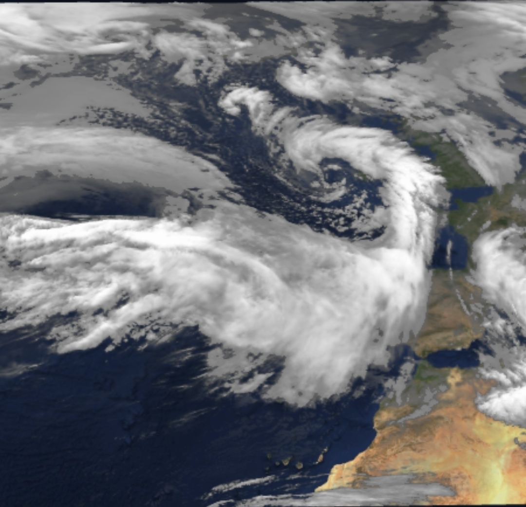 En las imágenes del satélite se pueden ver bandas nubosas asociadas a borrascas con gran radio de acción en el Atlántico Norte.